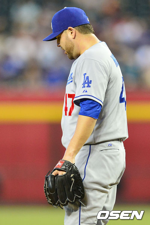 20일 (이하 한국시간) 미국 애리조나 피닉스 체이스필드에서 열린 2013 메이저리그 애리조나 다아아몬드백스와 LA 다저스 경기, 3회말 1사 주자 3루 애리조나 몬테로에게 역전 1타점 적시타를 맞은 다저스 선발 리키 놀라스코가 소리를 지르고 있다.