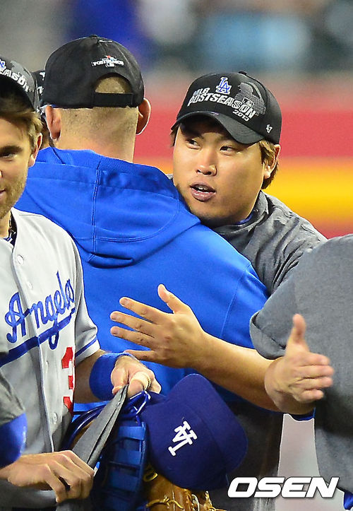 경기를 마치고 다저스 류현진이 파이프와 포옹을 나누고 있다./ rumi@osen.co.kr