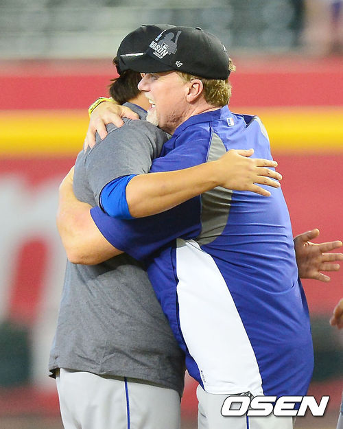경기를 마치고 다저스 류현진과 마크 맥과이어 코치가 포옹을 나누고 있다./ rumi@osen.co.kr