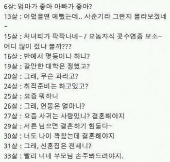 게시물에는 6세부터 33세까지 나이별로 추석 명절에 친척들에게 가장 많이 듣는 질문의 유형을 정리한 것이다.