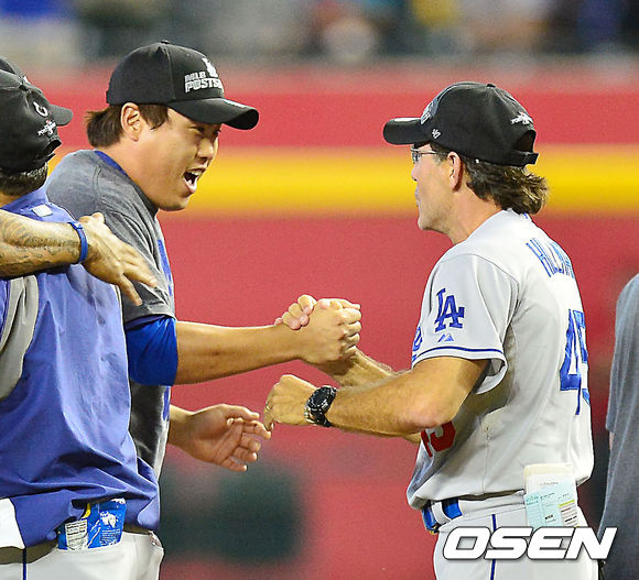 경기를 마치고 다저스 류현진이 힐만 코치와 하이파이브를 하고 있다./ rumi@osen.co.kr