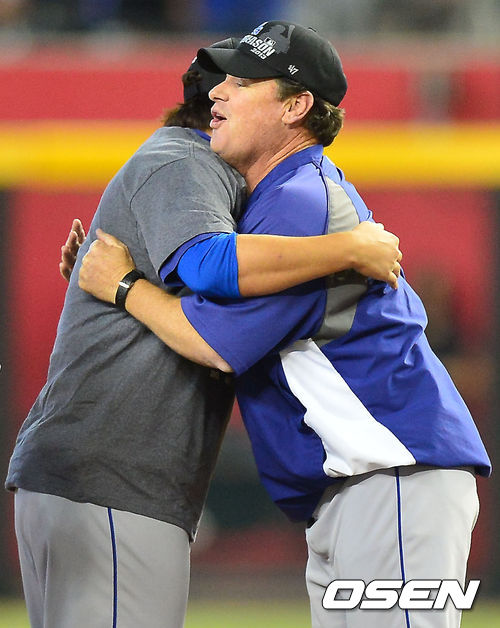 경기를 마치고 다저스 류현진이 릭 허니컷 투수 코치와 포옹을 나누고 있다./ rumi@osen.co.kr