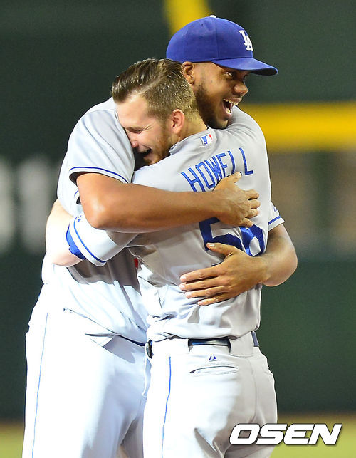 경기를 마치고 다저스 J.P 하웰과 켄리 잰슨이 포옹을 하고 있다./ rumi@osen.co.kr