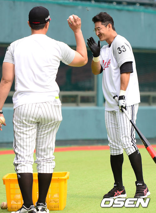 20일 오후 서울 잠실구장에서 열리는 '2013 한국야쿠르트 세븐 프로야구' LG 트윈스와 두산 베어스의 경기전 LG 최동수가 박용택의 타격훈련을 돕던 중 장난을 치고 있다.
