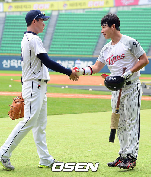 20일 오후 서울 잠실구장에서 열리는 '2013 한국야쿠르트 세븐 프로야구' LG 트윈스와 두산 베어스의 경기전 LG 현재윤이 두산 정재훈과 인사를 나누고 있다.