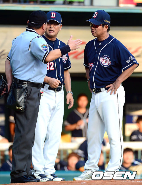 20일 오후 서울 잠실구장에서 열린 '2013 한국야쿠르트 세븐 프로야구' LG 트윈스와 두산 베어스의 경기, 2회초 무사 1,2루 두산 김진욱 감독이 최주환의 번트타구가 포수병살타로 처리되자 주심에게 어필하고 있다.