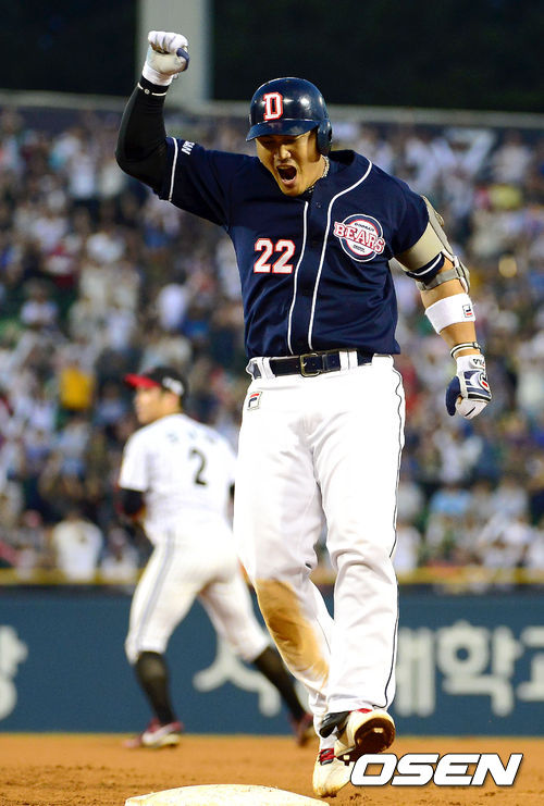 20일 오후 서울 잠실구장에서 열린 '2013 한국야쿠르트 세븐 프로야구' LG 트윈스와 두산 베어스의 경기, 5회초 1사 만루 두산 홍성흔이 2타점 적시타를 때린 뒤 기뻐하고 있다.