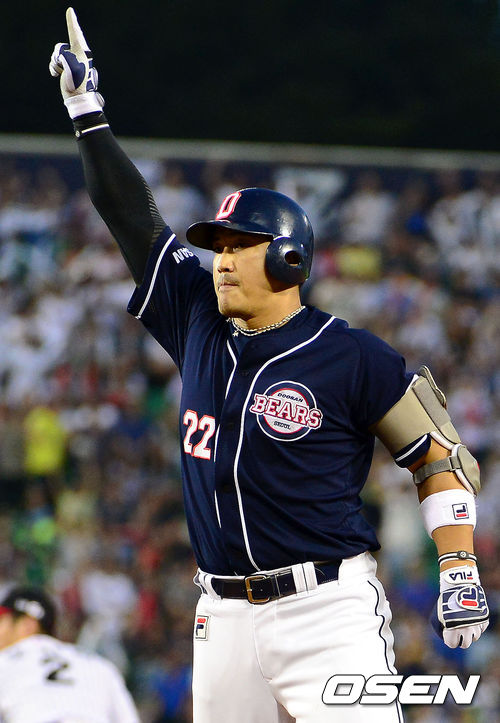 20일 오후 서울 잠실구장에서 열린 '2013 한국야쿠르트 세븐 프로야구' LG 트윈스와 두산 베어스의 경기, 5회초 1사 만루 두산 홍성흔이 2타점 적시타를 때린 뒤 기뻐하고 있다.