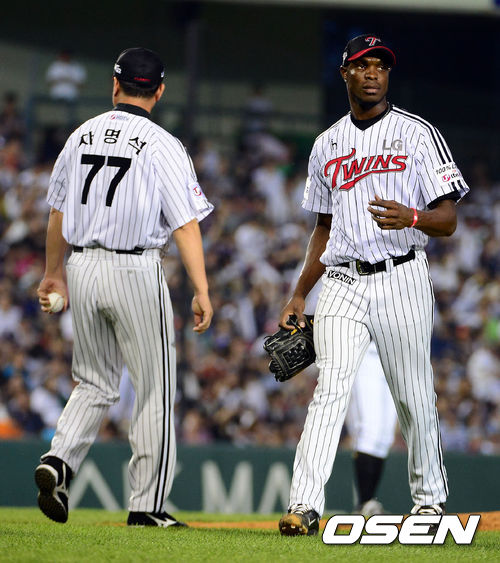 20일 오후 서울 잠실구장에서 열린 '2013 한국야쿠르트 세븐 프로야구' LG 트윈스와 두산 베어스의 경기, 5회초 2사 만루 리즈가 강판되어 더그아웃으로 들어오고 있다.