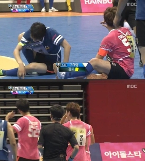 빅스 멤버 레오가 상대팀 선수 구자명의 백태클에 다리 부상을 당했다.