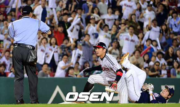 20일 오후 서울 잠실구장에서 열린 '2013 한국야쿠르트 세븐 프로야구' LG 트윈스와 두산 베어스의 경기, 7회말 무사 LG 오지환이 안타를 때린 뒤 3루 달리던 오지환이 태그아웃 당한 뒤 주심을 바라보고 있다.
