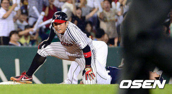 20일 오후 서울 잠실구장에서 열린 '2013 한국야쿠르트 세븐 프로야구' LG 트윈스와 두산 베어스의 경기, 7회말 무사 LG 오지환이 안타를 때린 뒤 3루 달리던 오지환이 태그아웃 당한 뒤 아쉬워하고 있다.