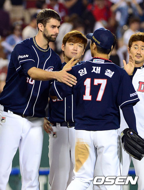 승리를 거둔 두산 니퍼트가 임재철과 기뻐하고 있다./youngrae@osen.co.kr