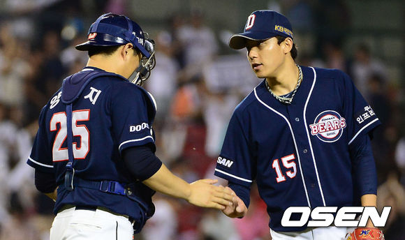 승리를 거둔 두산 오현택과 양의지가 악수를 나누고 있다./youngrae@osen.co.kr