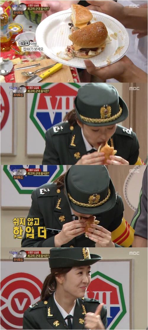 최현정 아나운서가 군대리아(군대 햄버거)로 폭풍 먹방(먹는 방송)을 보여줬다.