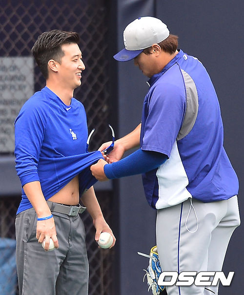 21일 (이하 한국시간) 미국 캘리포니아 샌디에이고 펫코 파크에서 열린 2013 메이저리그 샌디에이고 파드리스와 LA 다저스 경기, 경기 전 다저스 류현진이 마틴 김의 옷에 선글라스를 닦고 있다.