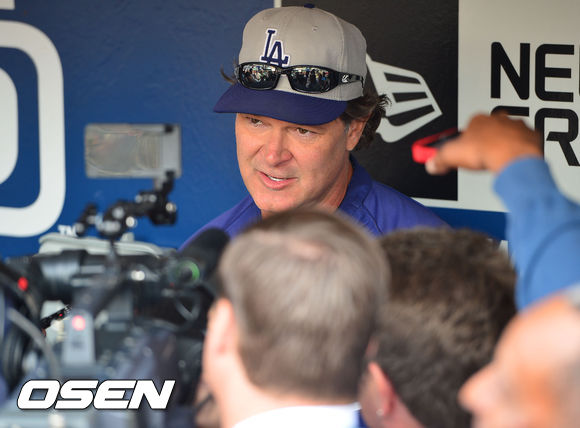 21일 (이하 한국시간) 미국 캘리포니아 샌디에이고 펫코 파크에서 열린 2013 메이저리그 샌디에이고 파드리스와 LA 다저스 경기, 경기 전 다저스 돈 매팅리 감독이 취재진에게 둘러싸여 인터뷰를 하고 있다.