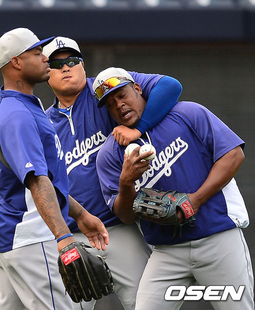 21일 (이하 한국시간) 미국 캘리포니아 샌디에이고 펫코 파크에서 열린 2013 메이저리그 샌디에이고 파드리스와 LA 다저스 경기, 경기 전 다저스 류현진과 유리베가 장난을 치고 있다.