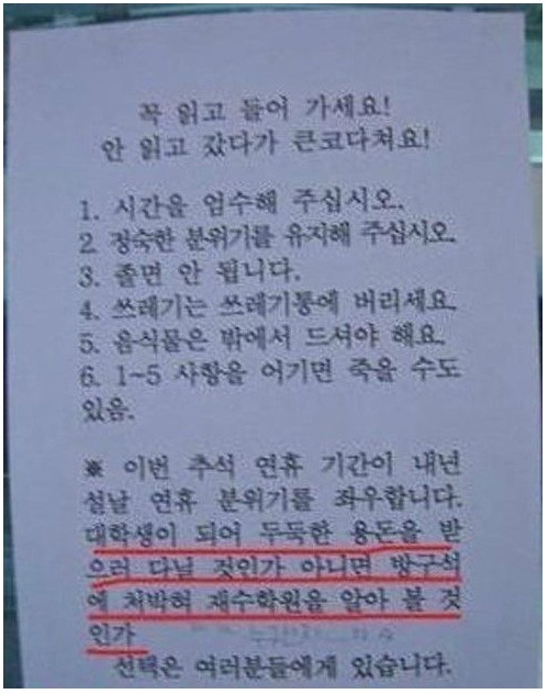 그러나 6번째 조항부터 약간씩 무서워진다. 위에 언급한 내용을 어기면 죽을 수도 있다고 협박했다. 사실상 협박문이나 마찬가지. 더구나 맨 아래 참고사항은 독서실 출입을 더욱 비장하게 만든다.