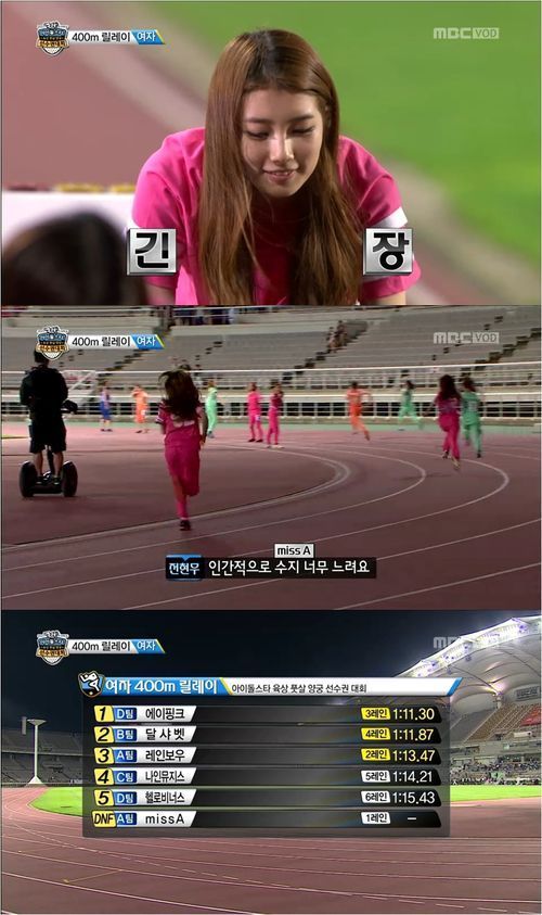 수지는 미쓰에이 멤버들과 함께 400m 릴레이에 참여했다. 첫 주자로 나선 수지는 뒤뚱뒤뚱 뛰면서 또 꼴찌를 했다. MC 전현무가 “수지 선수 인간적으로 너무 느리다”고 타박할 정도. 결국 수지가 너무 늦게 달리는 바람에 미쓰에이 다른 멤버들은 추격조차 하지 못하고 기권하는 상황에 놓였다. 여자 400m 릴레이에서는 윤보미, 박초롱, 정은지가 속한 에이핑크가 금메달을 획득했다.