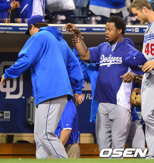 21일 (이하 한국시간) 미국 캘리포니아 샌디에이고 펫코 파크에서 열린 2013 메이저리그 샌디에이고 파드리스와 LA 다저스 경기, 덕아웃에서 푸이그가 라미레스를 조종해서 류현진에게 장난을 걸고 있다.