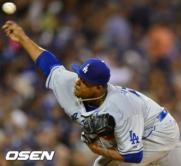 21일 (이하 한국시간) 미국 캘리포니아 샌디에이고 펫코 파크에서 열린 2013 메이저리그 샌디에이고 파드리스와 LA 다저스 경기, 다저스 선발 에딘슨 볼케스가 힘차게 공을 뿌리고 있다.