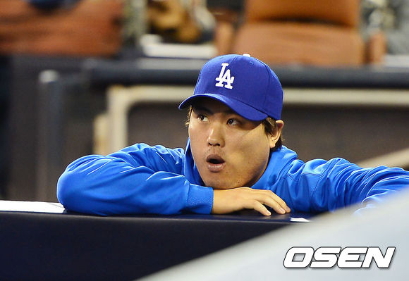 21일 (이하 한국시간) 미국 캘리포니아 샌디에이고 펫코 파크에서 열린 2013 메이저리그 샌디에이고 파드리스와 LA 다저스 경기, 덕아웃에서 류현진이 하품을 하고 있다.