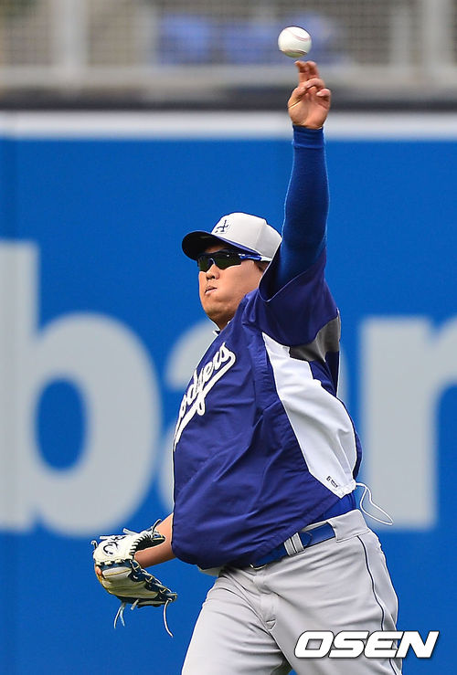 21일 (이하 한국시간) 미국 캘리포니아 샌디에이고 펫코 파크에서 열린 2013 메이저리그 샌디에이고 파드리스와 LA 다저스 경기, 경기 전 다저스 류현진이 캐치볼을 하며 몸을 풀고 있다.