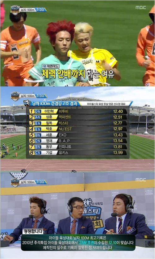 앞서 MBC는 지난 19일 방송된 ‘아육대’ 1부에서 기록 오류 실수를 했다. 비투비 민혁이 남자 100m 달리기 준결승 2조에서 12초 40으로 결승에 진출하자, 대회 신기록이라고 설명한 것. 하지만 조권이 지난 2010년 9월 방송에서 12초 10의 기록을 수립한 적 있어 민혁의 기록은 신기록 경신이 아니었다.