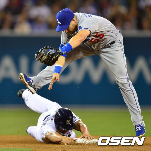 21일 (이하 한국시간) 미국 캘리포니아 샌디에이고 펫코 파크에서 열린 2013 메이저리그 샌디에이고 파드리스와 LA 다저스 경기, 3회말 무사 주자 1루 샌디에이고 데노피아의 유격수 땅볼때 다저스 2루수 스킵 슈마커가 2루에서 베너블을 포스아웃 시킨 후 점프하며 1루로 송구하고 있다.