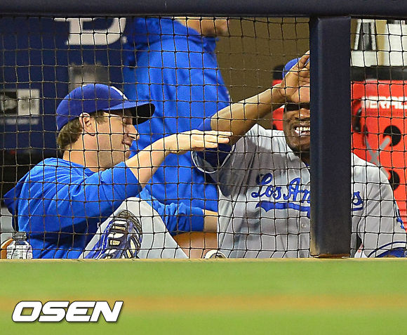 21일 (이하 한국시간) 미국 캘리포니아 샌디에이고 펫코 파크에서 열린 2013 메이저리그 샌디에이고 파드리스와 LA 다저스 경기, 덕아웃에서 A.J 엘리스가 유리베와 하이파이브를 하고 있다.