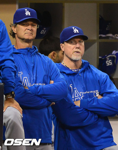 21일 (이하 한국시간) 미국 캘리포니아 샌디에이고 펫코 파크에서 열린 2013 메이저리그 샌디에이고 파드리스와 LA 다저스 경기, 덕아웃에서 다저스 돈 매팅리 감독과 마크 맥과이어 타격 코치가 심각한 표정으로 경기를 지켜보고 있다.