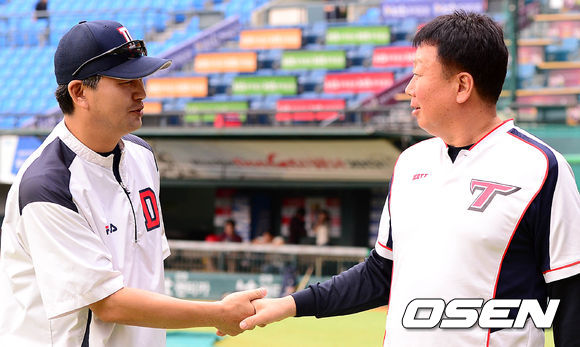 21일 오후 서울 잠실야구장에서 열린 2013 한국야쿠르트 세븐프로야구 두산 베어스와 KIA 타이거즈의 경기, 경기에 앞서 두산 김진욱 감독과 KIA 선동렬 감독이 인사를 나누고 있다.