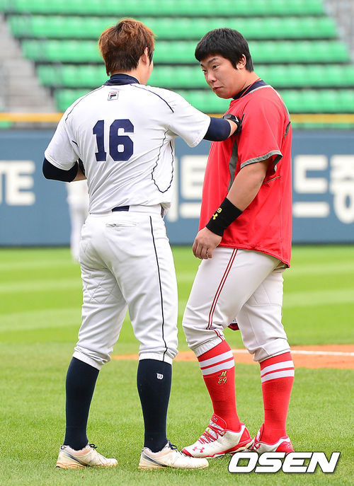 21일 오후 서울 잠실야구장에서 열린 2013 한국야쿠르트 세븐프로야구 두산 베어스와 KIA 타이거즈의 경기, 경기에 앞서 두산 이원석과 KIA 나지완이 인사를 나누고 있다.