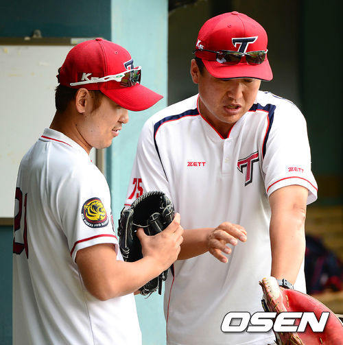 21일 오후 서울 잠실야구장에서 열린 2013 한국야쿠르트 세븐프로야구 두산 베어스와 KIA 타이거즈의 경기, 경기에 앞서 KIA 윤석민이 김지훈 코치와 이야기를 나누고 있다.