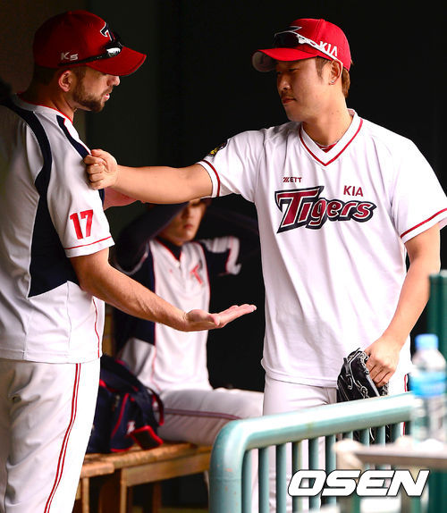 21일 오후 서울 잠실야구장에서 열린 2013 한국야쿠르트 세븐프로야구 두산 베어스와 KIA 타이거즈의 경기, 경기에 앞서 KIA 윤석민이 빌로우와 이야기를 나누고 있다.