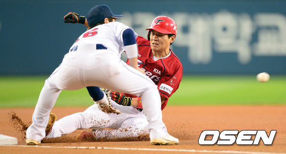 21일 오후 서울 잠실야구장에서 열린 2013 한국야쿠르트 세븐프로야구 두산 베어스와 KIA 타이거즈의 경기, 1회초 무사에서 KIA 신종길이 우전 3루타를 치고 슬라이딩을 하고 있다.