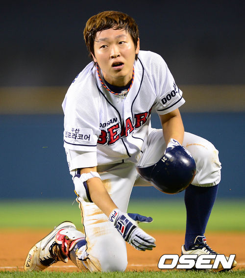 21일 오후 서울 잠실야구장에서 열린 2013 한국야쿠르트 세븐프로야구 두산 베어스와 KIA 타이거즈의 경기, 4회말 1사 2,3루에서 두산 정수빈이 동점으로 연결된 내야땅볼을 치고 1루에서 아웃 처리된 후 아쉬워하고 있다.