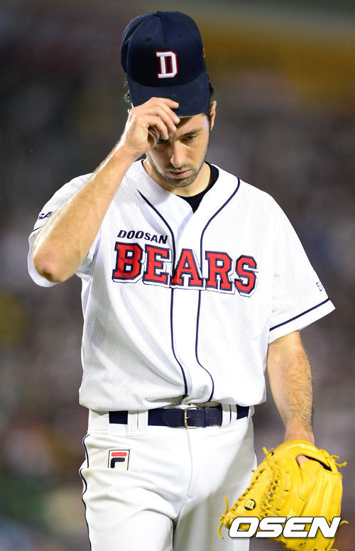 21일 오후 서울 잠실야구장에서 열린 2013 한국야쿠르트 세븐프로야구 두산 베어스와 KIA 타이거즈의 경기, 5회초 1사 1,2루에서 두산 핸킨스가 마운드를 내려가며 아쉬운 표정을 짓고 있다.