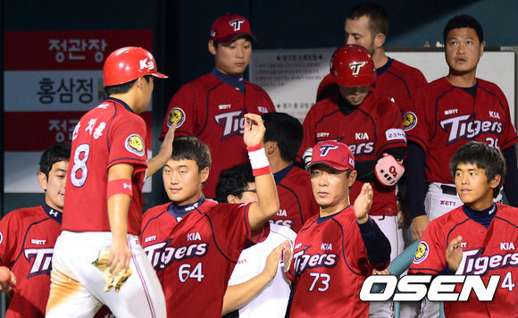 21일 오후 서울 잠실야구장에서 열린 2013 한국야쿠르트 세븐프로야구 두산 베어스와 KIA 타이거즈의 경기, 5회초 1사 만루에서 KIA 황정립의 우전 2타점 적시타 떄 홈을 밟은 3루주자 안치홍이 덕아웃에서 동료들의 축하를 받고 있다.