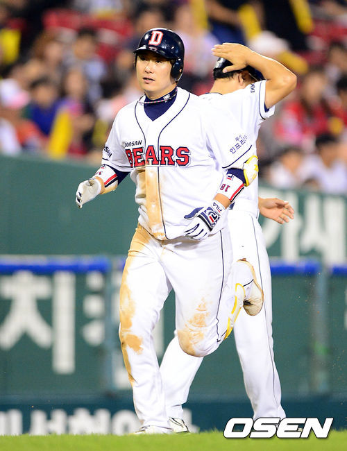 21일 오후 서울 잠실야구장에서 열린 2013 한국야쿠르트 세븐프로야구 두산 베어스와 KIA 타이거즈의 경기, 7회말 2사 1,2루에서 두산 이원석이 좌월 스리런 홈런을 치고 그라운드를 돌며 환호하고 있다.