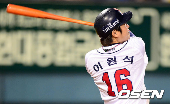 21일 오후 서울 잠실야구장에서 열린 2013 한국야쿠르트 세븐프로야구 두산 베어스와 KIA 타이거즈의 경기, 7회말 2사 1,2루에서 두산 이원석이 좌월 스리런 홈런을 치고 있다.