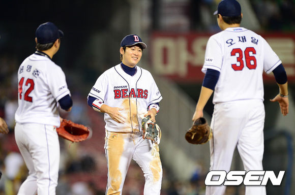 경기 종료 후 두산 이원석이 동료들과 승리의 기쁨을 나누고 있다./sunday@osen.co.kr