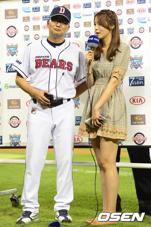 경기 종료 후 두산 김진욱 감독이 KBS N 정인영 아나운서와 인터뷰를 하고 있다./sunday@osen.co.kr