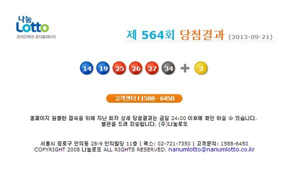 21일 추첨된 564회차 나눔로또 당첨번호는 '14, 19, 25, 26, 27, 34'이고 보너스 번호는 '2'이다.