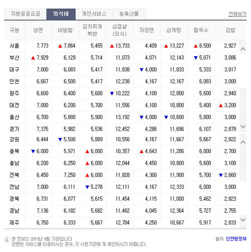 안전행정부는 최근 물가정보 공개서비스를 통해 지난 8월의 전국 각 지역의 외식비 평균을 알 수 있는 표를 공개했다. 지방공공요금에 대한 물가조사 통계에서 지난 8월 기준 전국 각 지역의 외식비 평균 가격 조사한 결과, 8개 대상 품목 중 절반이 서울에서 가장 비싸게 팔리는 것으로 나타났다.