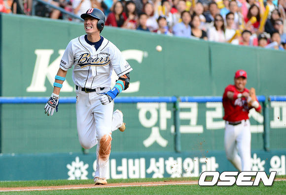 22일 오후 서울 잠실구장에서 열린 '2013 한국야쿠르트 세븐 프로야구' 두산 베어스와 KIA 타이거즈의 경기, 2회말 2사 두산 김재호가 좌중간 3루타를 때린 뒤 3루 송구 실책을 틈타 홈까지 쇄도하고 있다. 결과는 아웃.