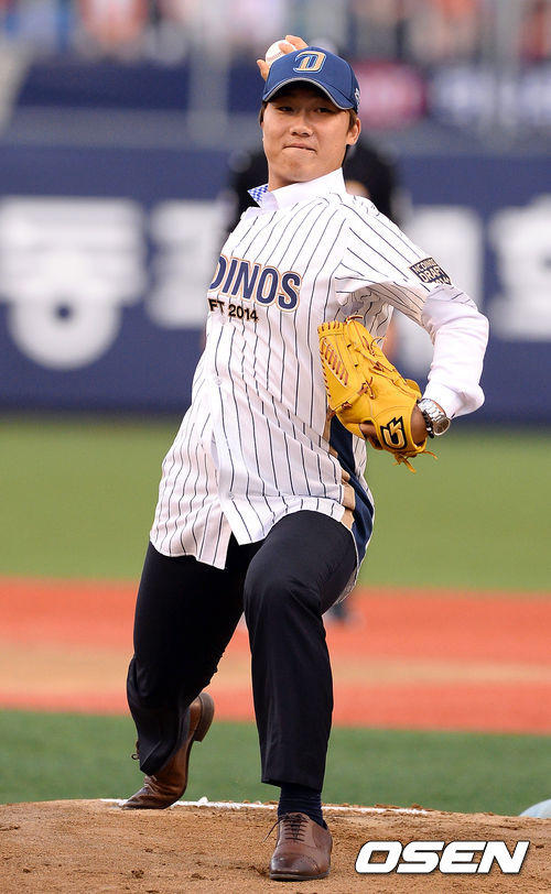 22일 오후 창원 마산야구장에서 열린 2013 한국야쿠르트 세븐프로야구 NC 다이노스와 LG 트윈스의 경기, 경기에 앞서 2014 NC 신인 1차지명 강민국이 시구를 하고 있다.