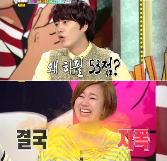 이날 MC 박미선은 '몸으로 말해요' 게임을 진행하기에 앞서 "승리하는 팀에게는 53점을 부여하겠다"고 밝혔다. 이에 MC 규현은 "왜 하필 53점이냐"고 궁금증을 드러냈고, 이에 박미선은 "내 몸무게다"고 말했다.