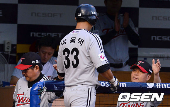 22일 오후 창원 마산야구장에서 열린 2013 한국야쿠르트 세븐프로야구 NC 다이노스와 LG 트윈스의 경기, 3회초 1사 1, 3루 LG 정성훈의 희생플라이로 3루 박용택이 홈을 밟은뒤 김기태 감독과 하이파이브를 하고 있다.